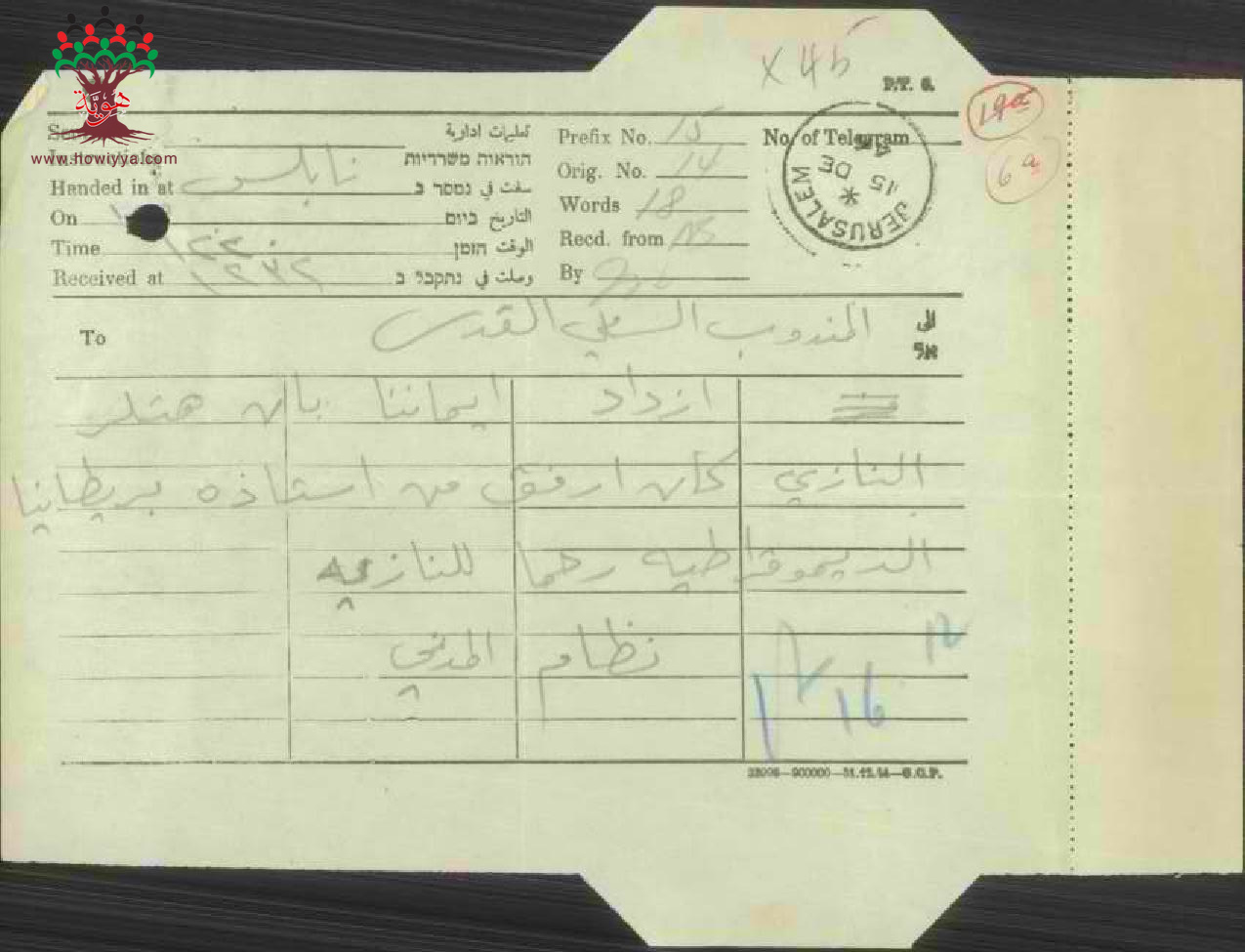 تلغراف من نظام مدني الى المندوب السامي يصف فيها بأن هتلر النازي كان أرفق من بريطانيا