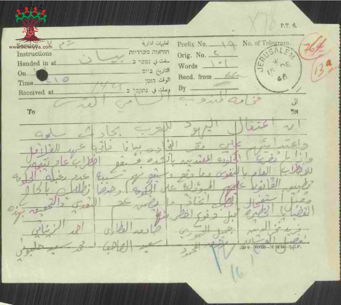 تلغراف مرسل من وجهاء بيسان الى المندوب السامي احتجاجا على اعتداء اليهود على شبان من قرية سلمة
