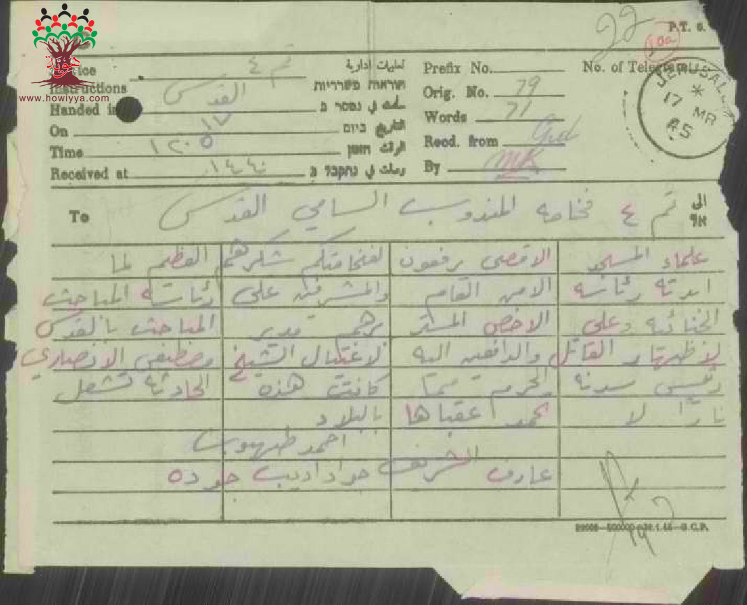 تلغراف مرسل من علماء المسلمين في الأقصى الى المندوب السامي يشكرونه على الجهود في سبيل اظهار قاتل الشيخ مصطفى الأنصاري