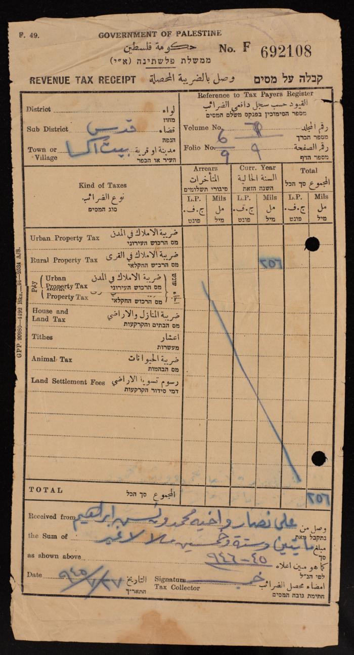 وصل بالضريبة المحصلة من علي نصار محمود الخطيب وأخيه محمد على املاكهم في قرية بيت إكسا بقيمة 256 ملا
