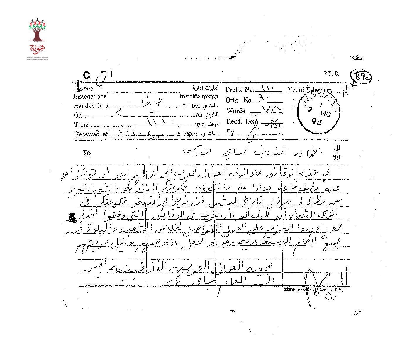 تلغراف مرسل من سامي طه أمين سر جمعية العمال العربية الفلسطينية الى المندوب السامي احتجاجا على وعد بلفور بعر الاضراب الذي قامت به الجمعية ضد جميع المظالم الاستعمارية التي تقوم بها حكومته من خلال هذا الوعد