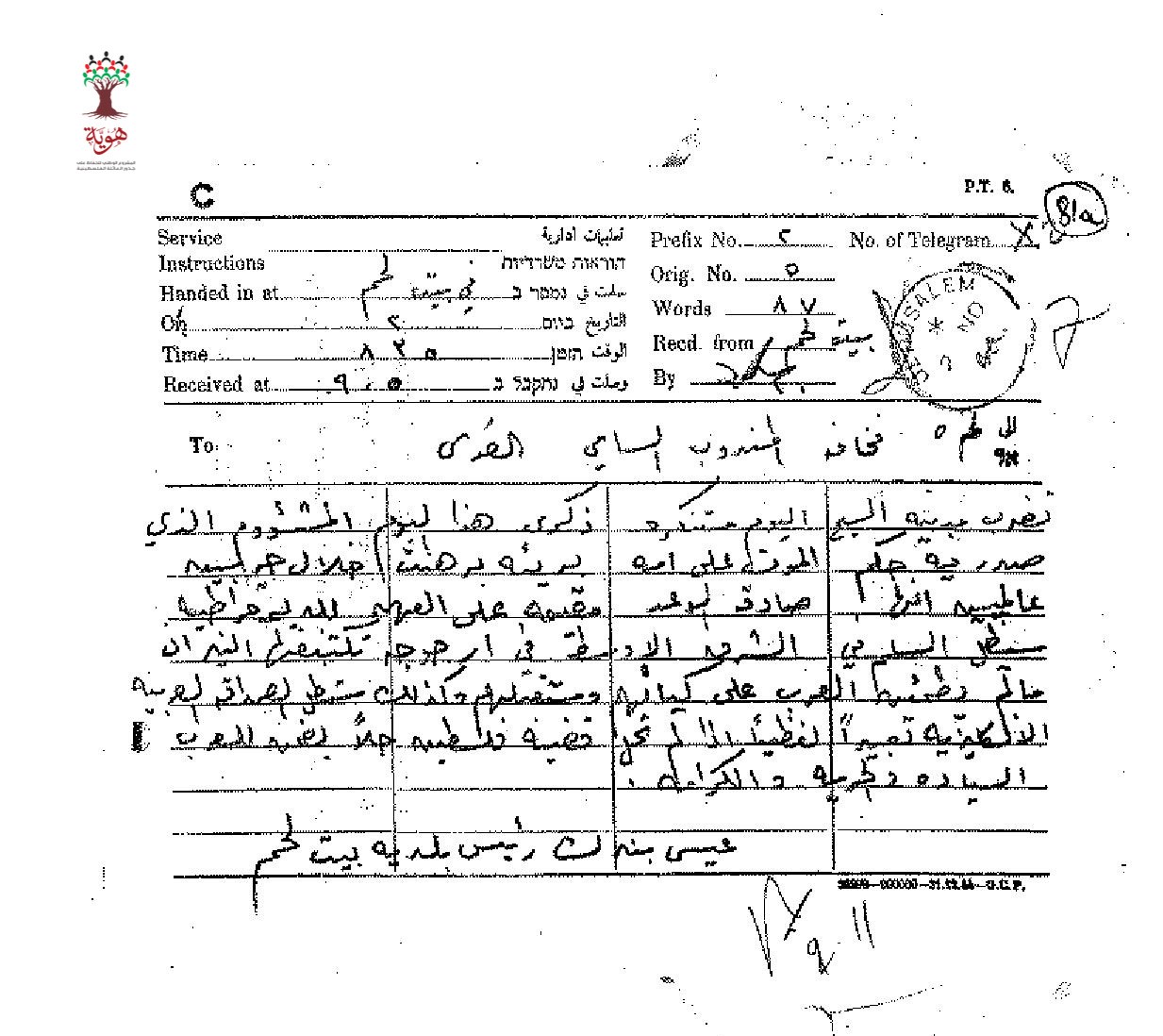 تلغراف مرسل من عيسى بندك رئيس بلدية بيت لحم الى المندوب السامي احتجاجا على وعد بلفور