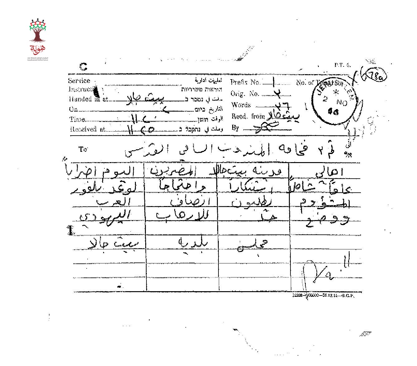 تلغراف مرسل من مجلس بلدية بيت جالا الى المندوب السامي احتجاجا على وعد بلفور معلنين الإضراب استنكارا لهذا الوعد لوقف الارهاب اليهودي
