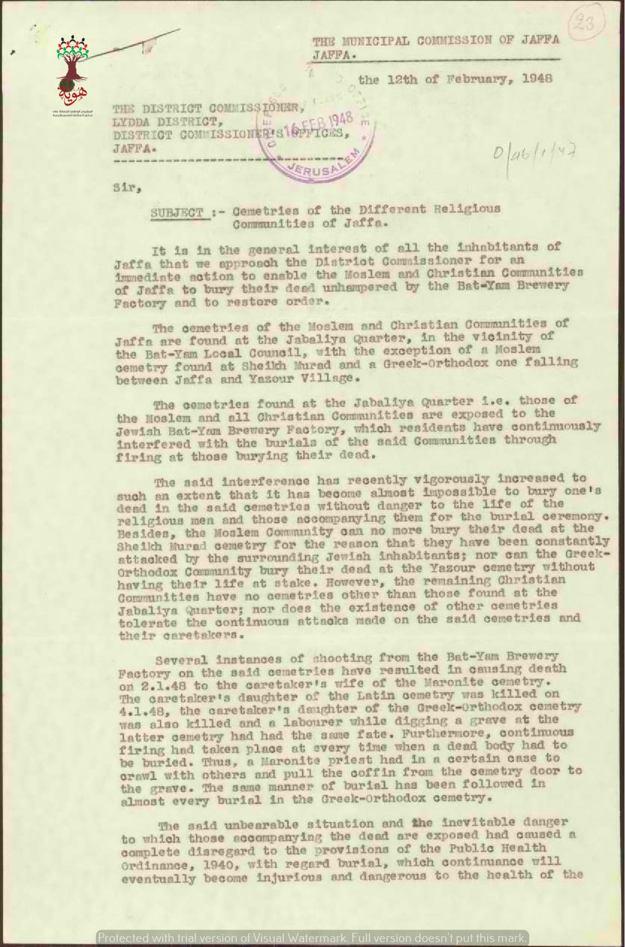 رسالة من اللجنة البلدية في يافا الى مفوض المقاطعة بخصوص مدافن الديانات المختلفة في يافا
