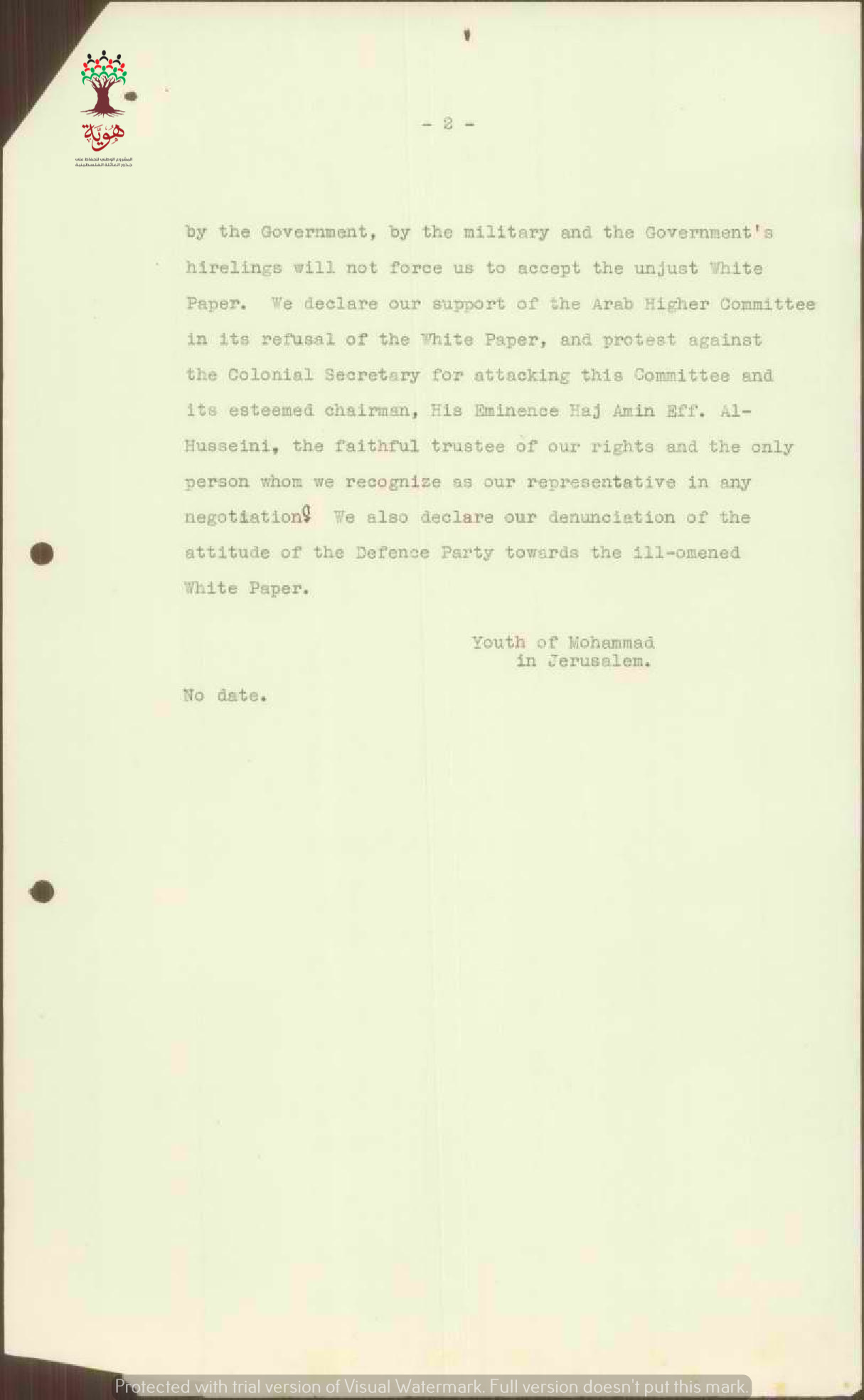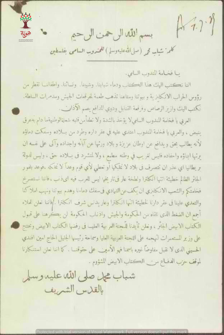 كلمة شباب محمد صلى الله عليه وسلّم الى المندوب السامي اعتراضا على الاعتداءات الإنجليزية على العرب والتهجم على أمين الحسيني