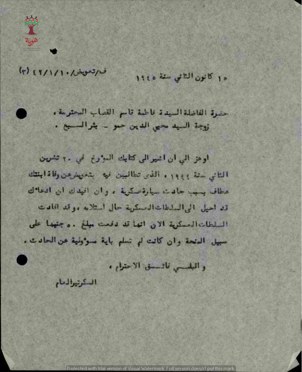 رسالة من السكرتير العام الى السيدة فاطمة قاسم القصاب بخصوص حادثة وفاة ابنتها اثر دهس سيارة عسكرية وطلبها تعويض عن وفاتها.