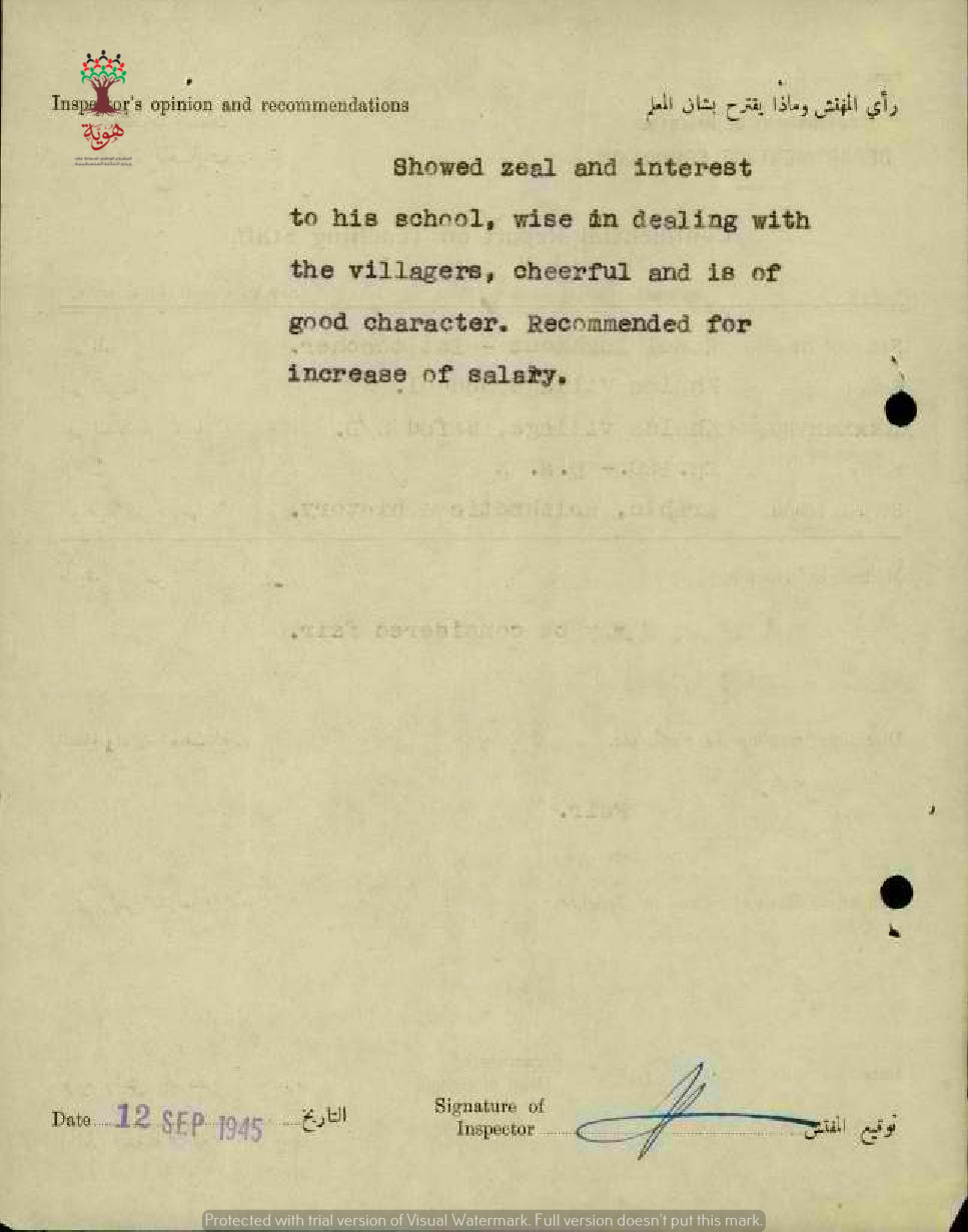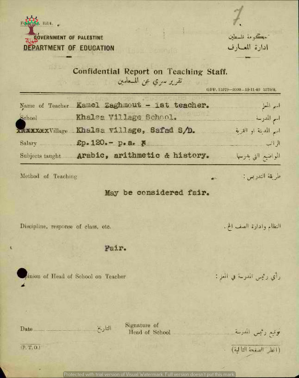 تقرير تفصيلي عن أداء المعلم كامل زغموت في مدرسة الخالصة للذكور سنة 1945