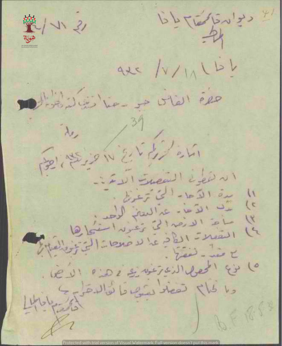 رسالة من قائمقام يافا المالي الى جبور حنا التكة بخصوص تفاصيل تأجيرهم حصة الحكومة من أرض الوقف