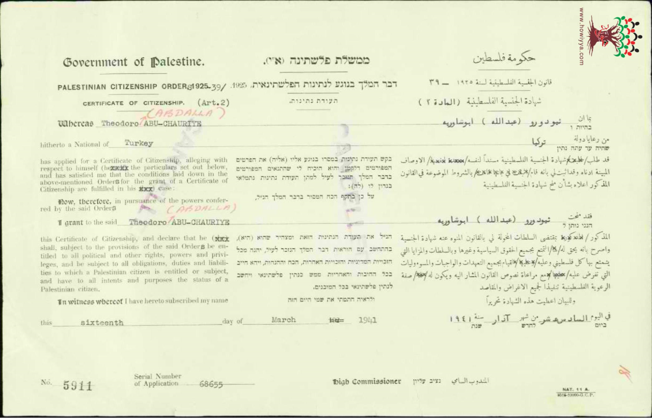 مرفق مجموعة من الوثائق التي تخص السيد عبدالله (ثيودورو) أبو شاورية المولود في بيت جالا عام 1896 تقريباً، وقد هاجر إلى تشيلي عام 1911 واستقر في مدينة كونسبسيون حيث عمل بالتجارة وتزوج وأنجب أربعة أطفال حتى العام 1940، حين تقدم بطلب رسمي لاستعادة جنسيته الفلسطينية في شهر أيلول/سبتمبر 1940.. وقد استعادها فعلاً في شهر آذار/مارس 1941 كما هو مبيّن في الوثائق.