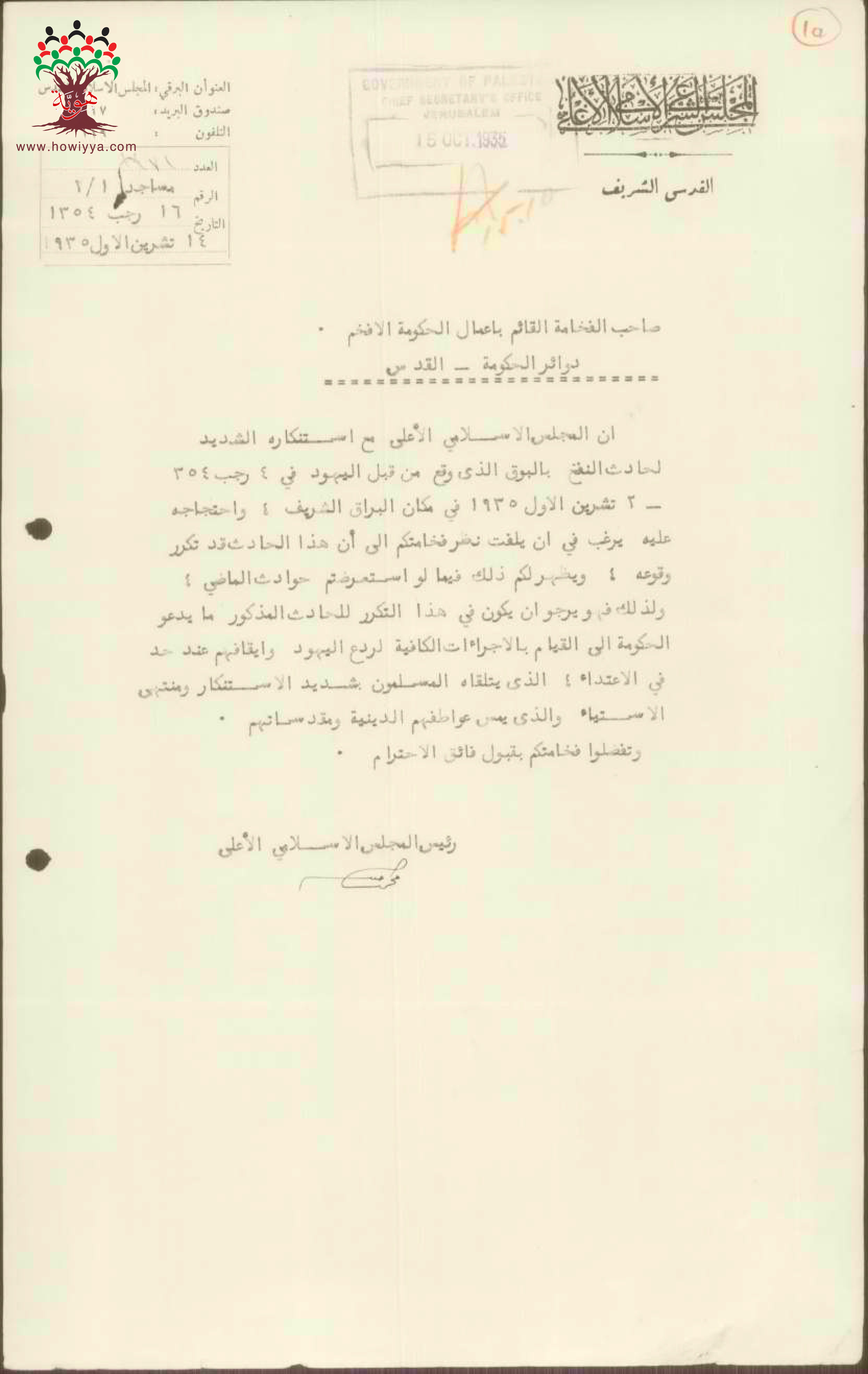 رسالة من رئيس المجلس الاسلامي الأعلى الى القائم بأعمال الحكومة في القدس يسنكر فيها حادثة النفخ بالبوق عند البراق