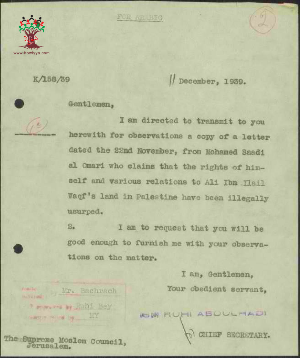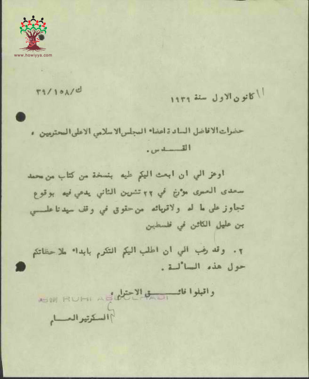 رسالة من السكرتير العام الى أعضاء المجلس الاسلامي الأعلى بخصوص كتاب سعدي العمري حول التجاوزات في حقوق وقف علي بن عليل