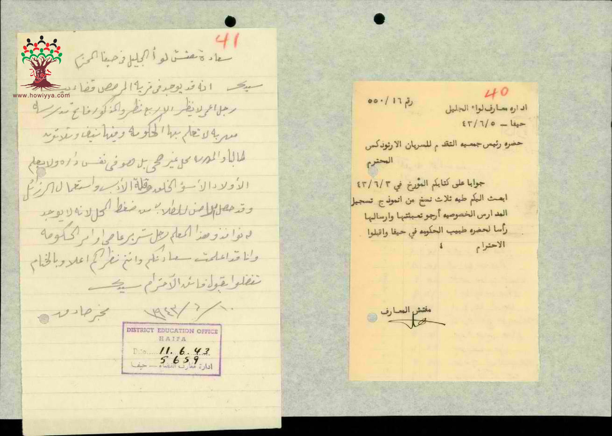 رسالة ونموذج لفتح مدرسة خصوصية لطائفة الارثودكس فس حيفا عن طريق جمعية السريان الأرثودكس