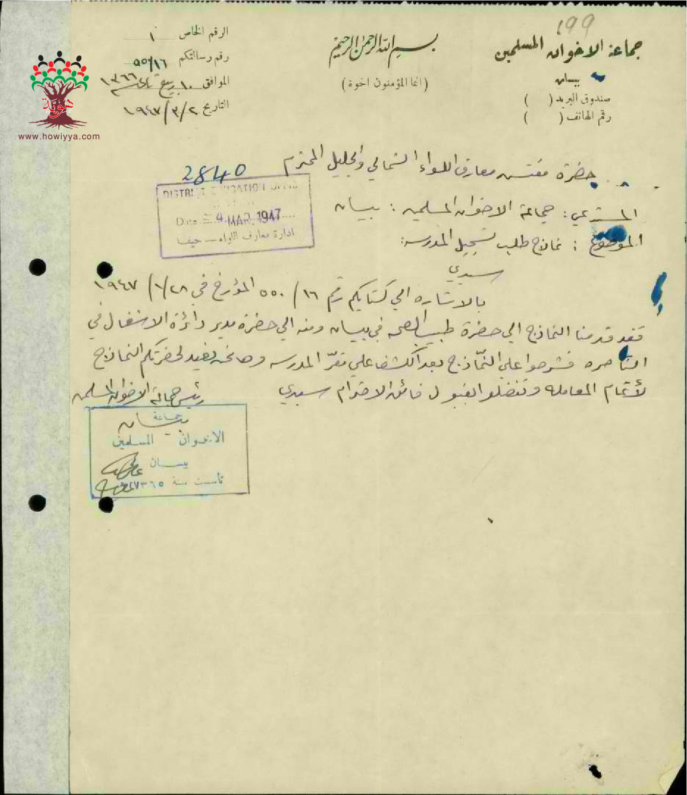 مجموعة رسائل بخصوص نماذج تسجيل مدرسة في بيسان عن طريق جمعية الاخوان المسلمين