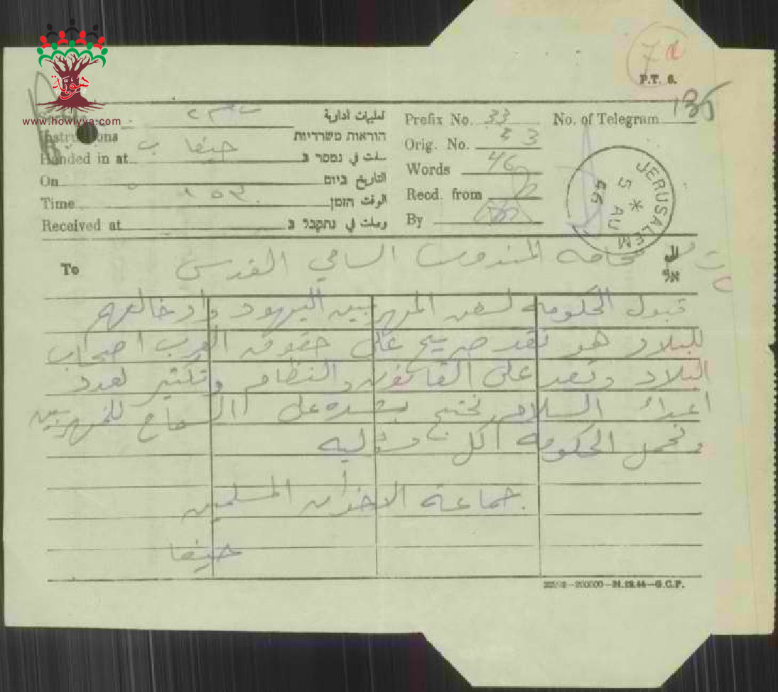 تلغراف مرسل من جماعة الاخوان المسلمين الى المندوب السامي احتجاجا على استمرار الهجرة اليهودية الى فلسطين