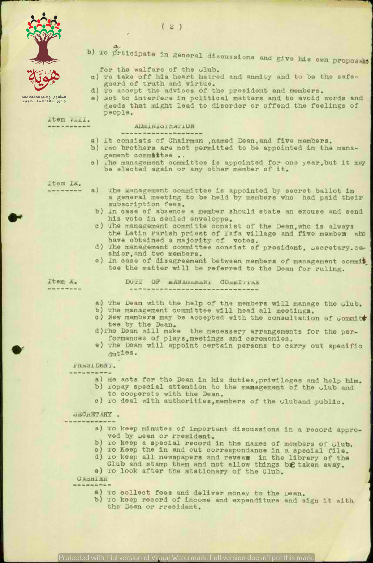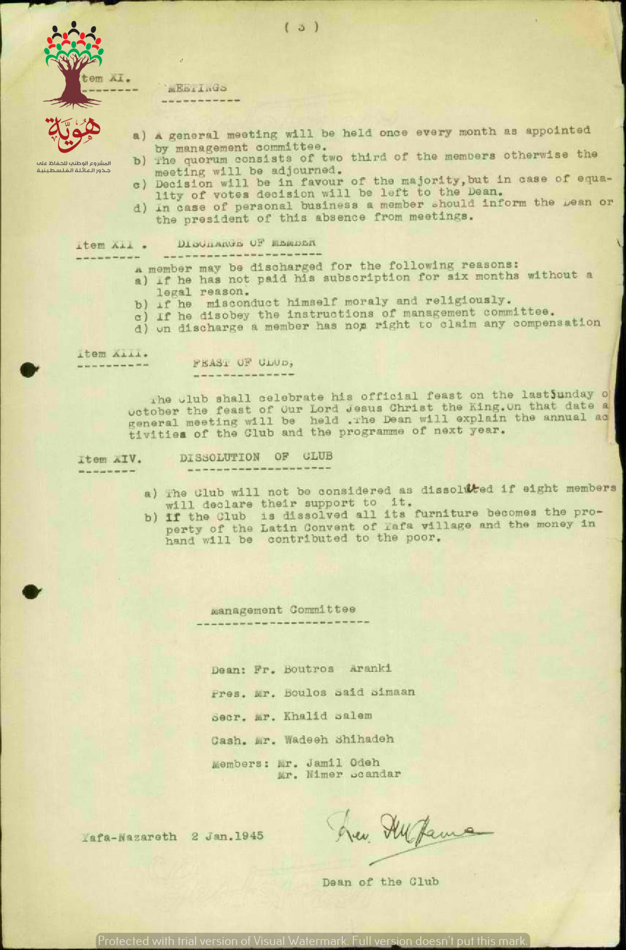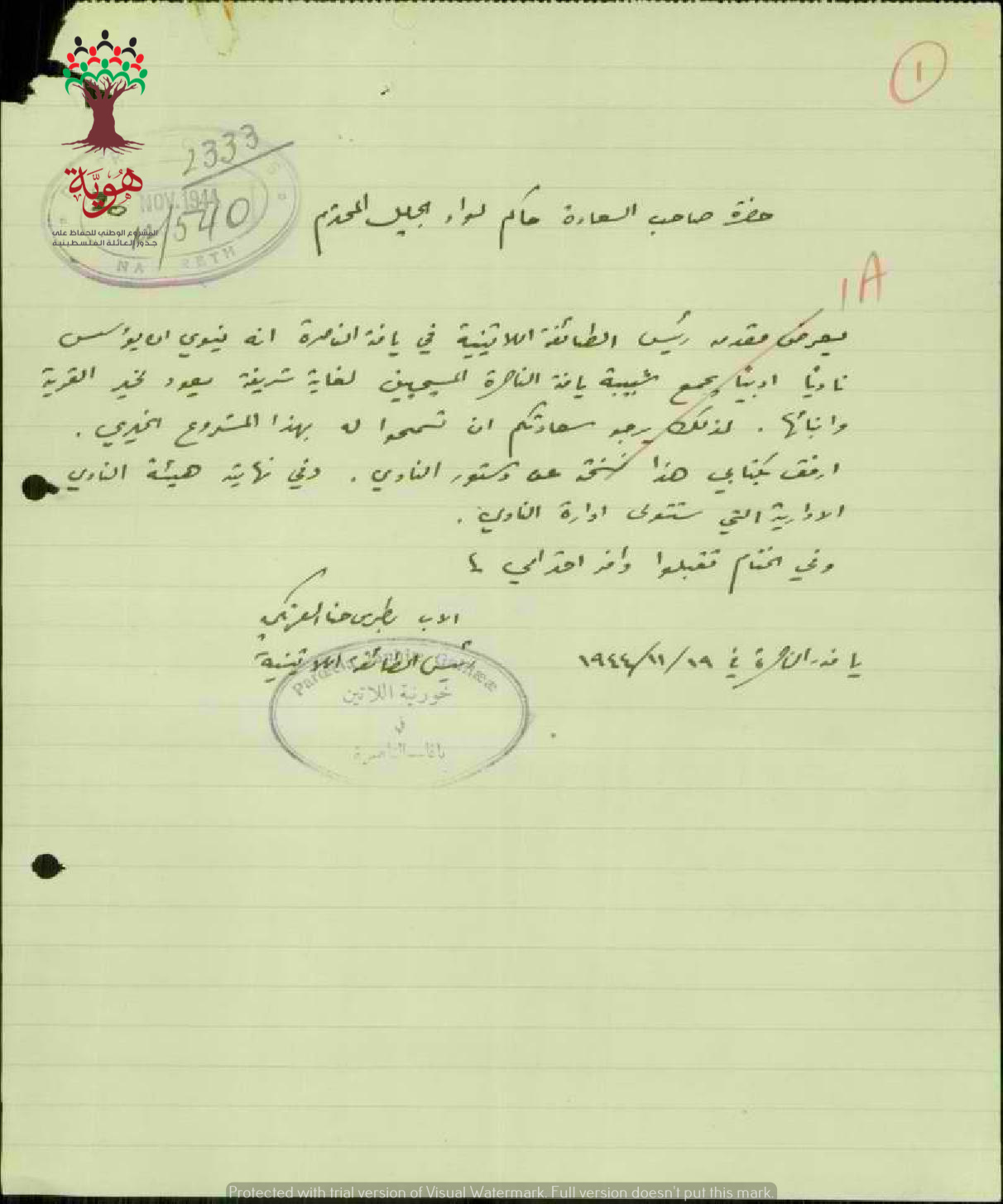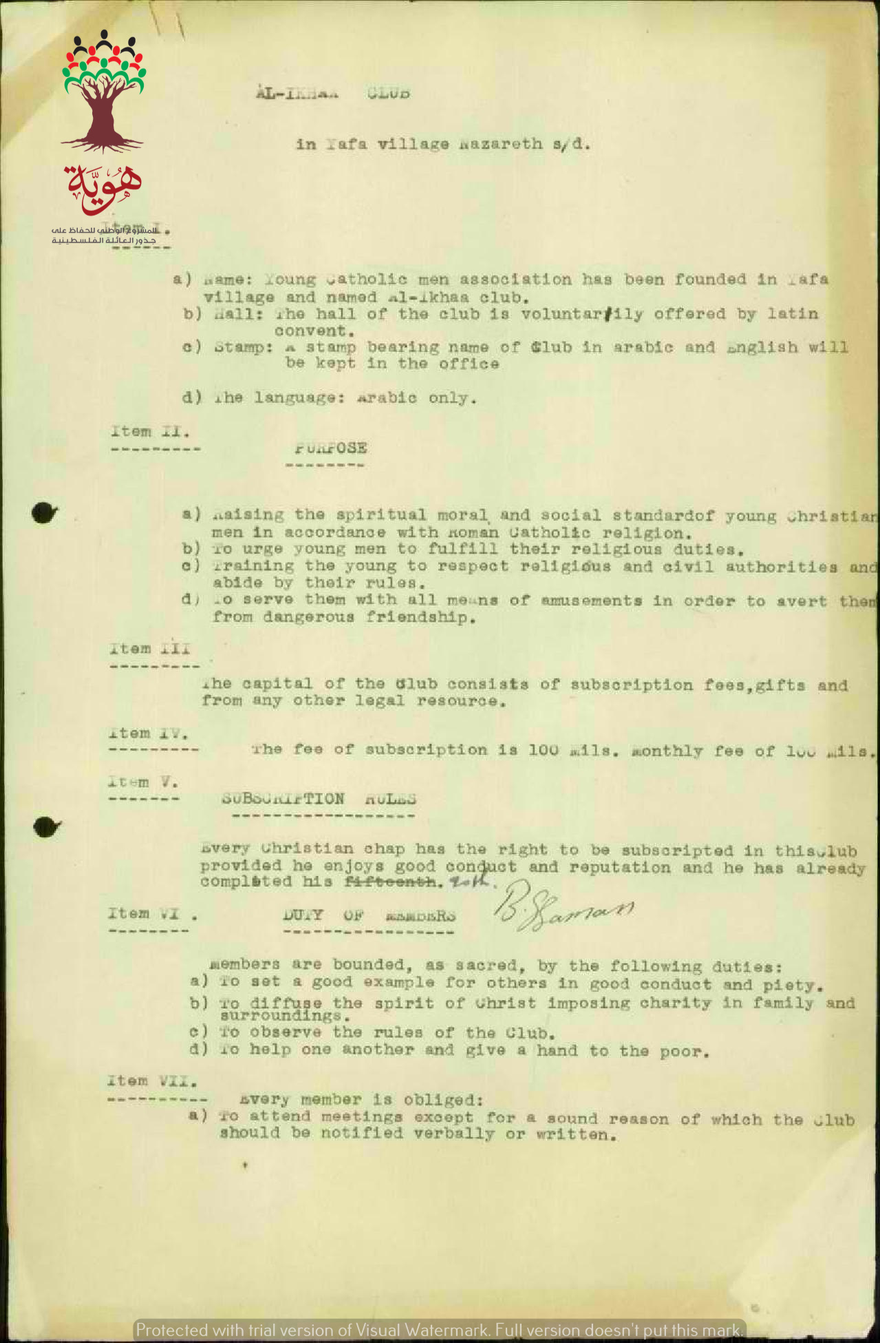 رسالة من الأب بطرس حنا الى حاكم لواء الجليل لتأسيس نادي الإخاء في يافة الناصرة مرفقة بدستور النادي وقانونه الداخلي وهو عبارة عن نادي أدبي مسيحي
