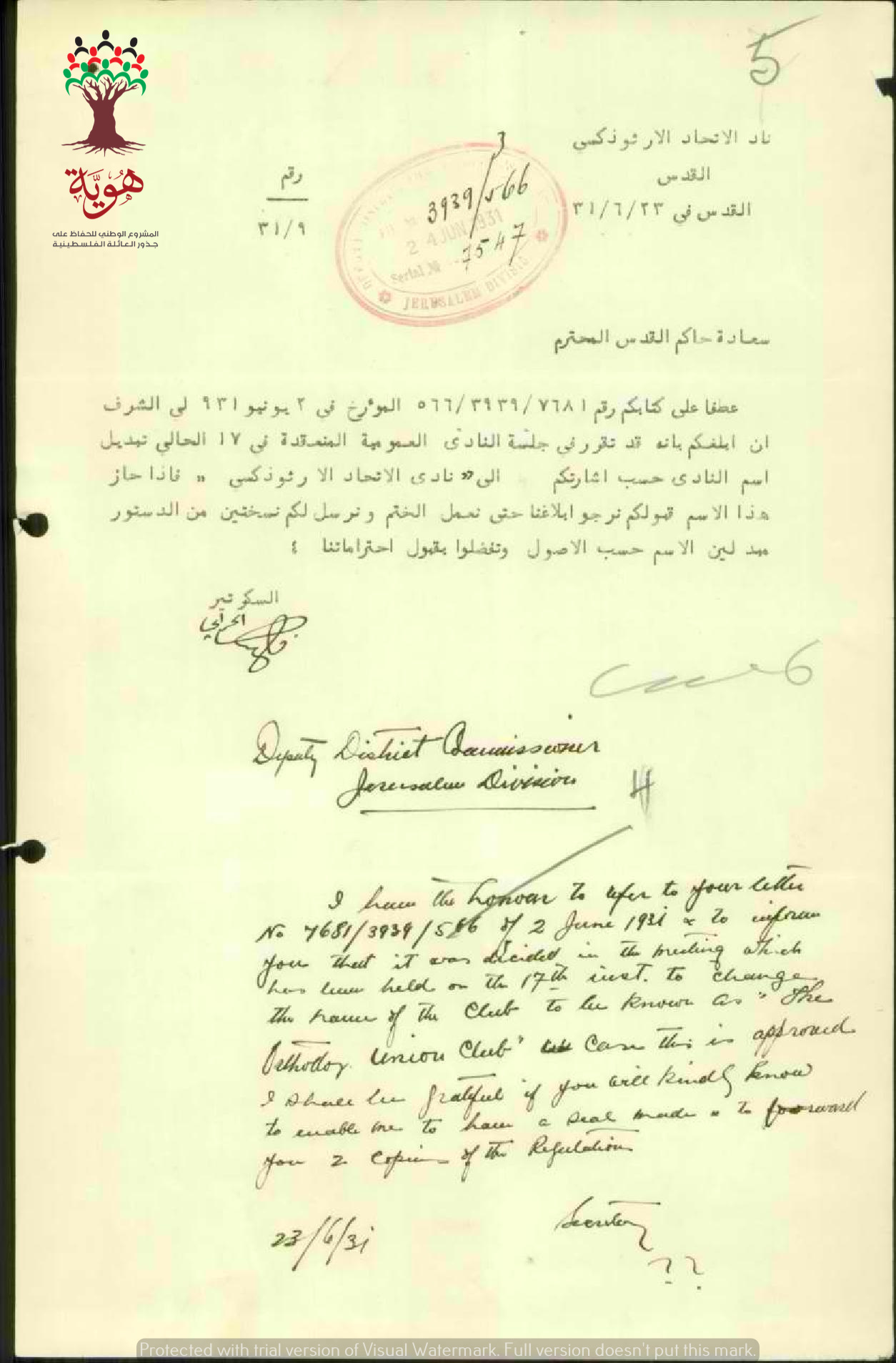 رسالة من فرحالحرامي سكرتير نادي الإتحاد الأرثوذكسي الى حاكم القدس بخصوص تغيير اسم النادي