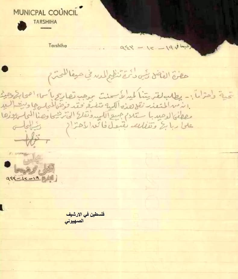 رسالة من مجلس ترشيحا المحلي الى رئيس تنظيم دائرة المدن بتفويض مصطفى الوحيد لتسلم كميات الاسمنت ونقلها الى ترشيحا