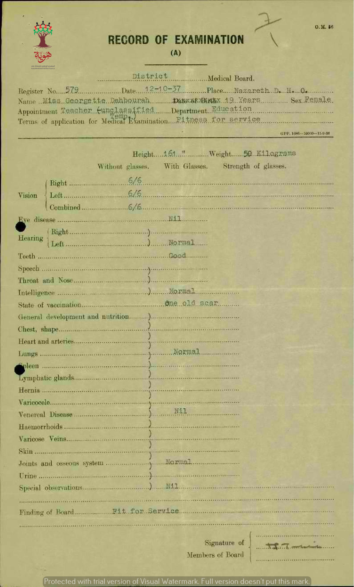 تقرير طبي لتعيين المعلمة جورجيت دحبورة في مدرسة الناصرة بأنها صالحة للخدمة