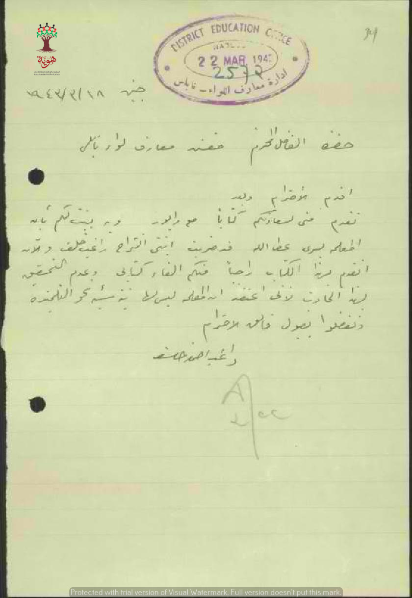 شكوى من راغب أحمد خلف على المعلمة يسرى عطا الله بأنها ضربت ابنته.