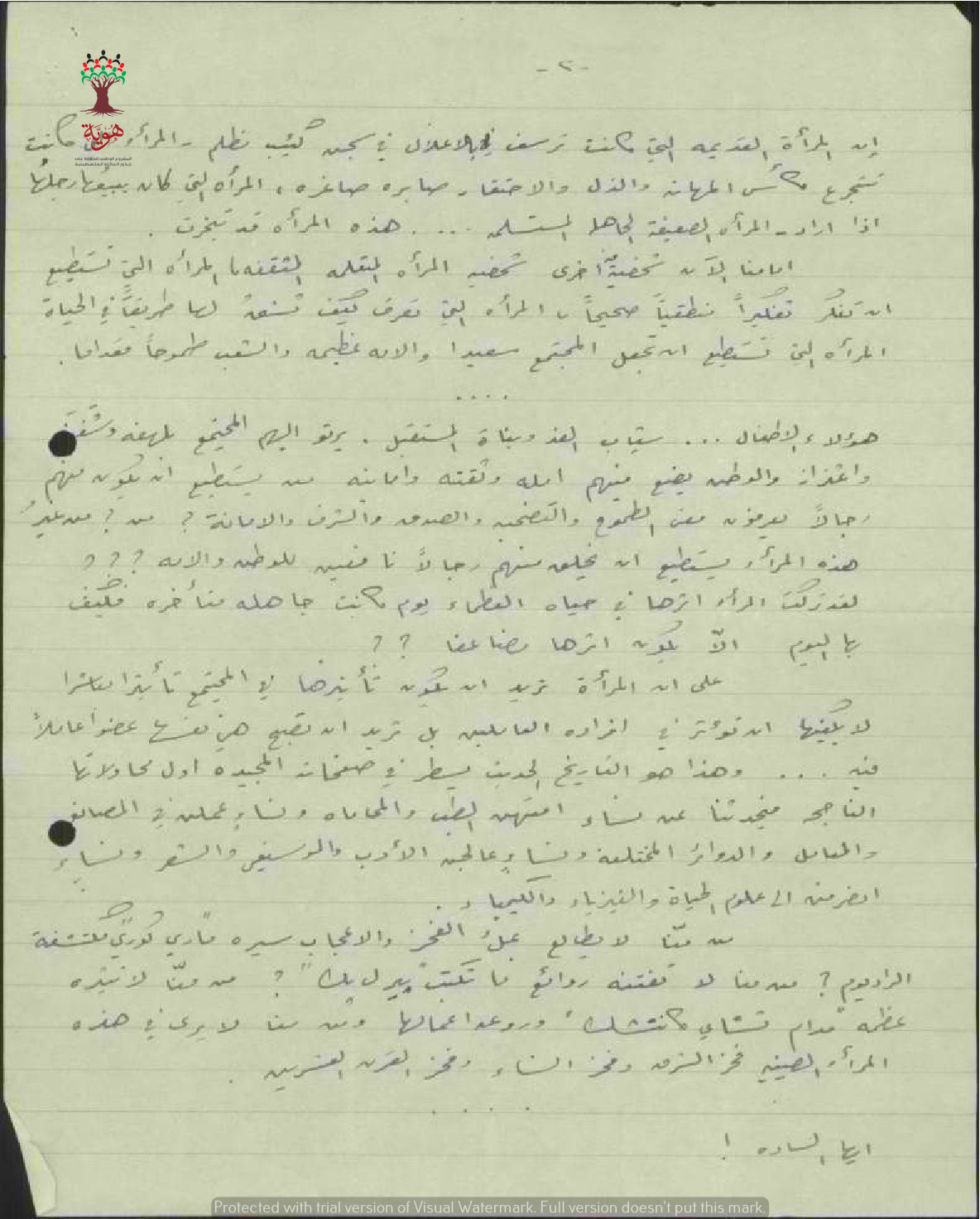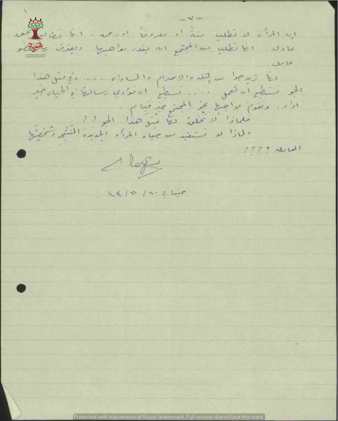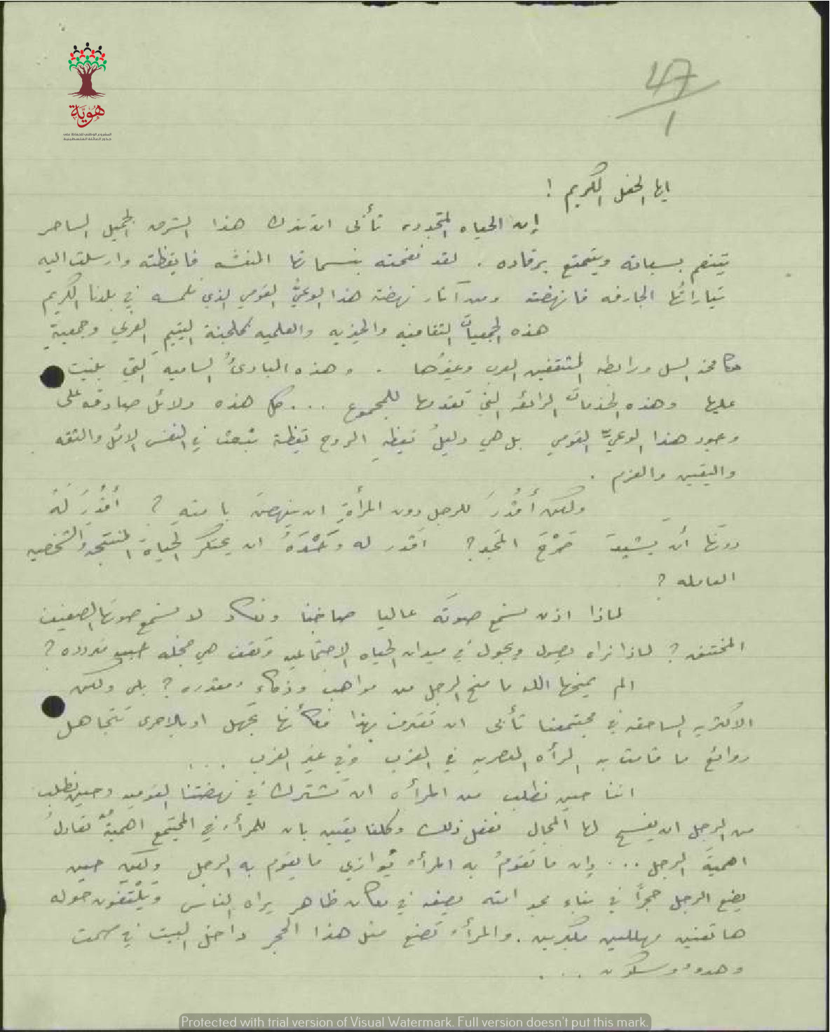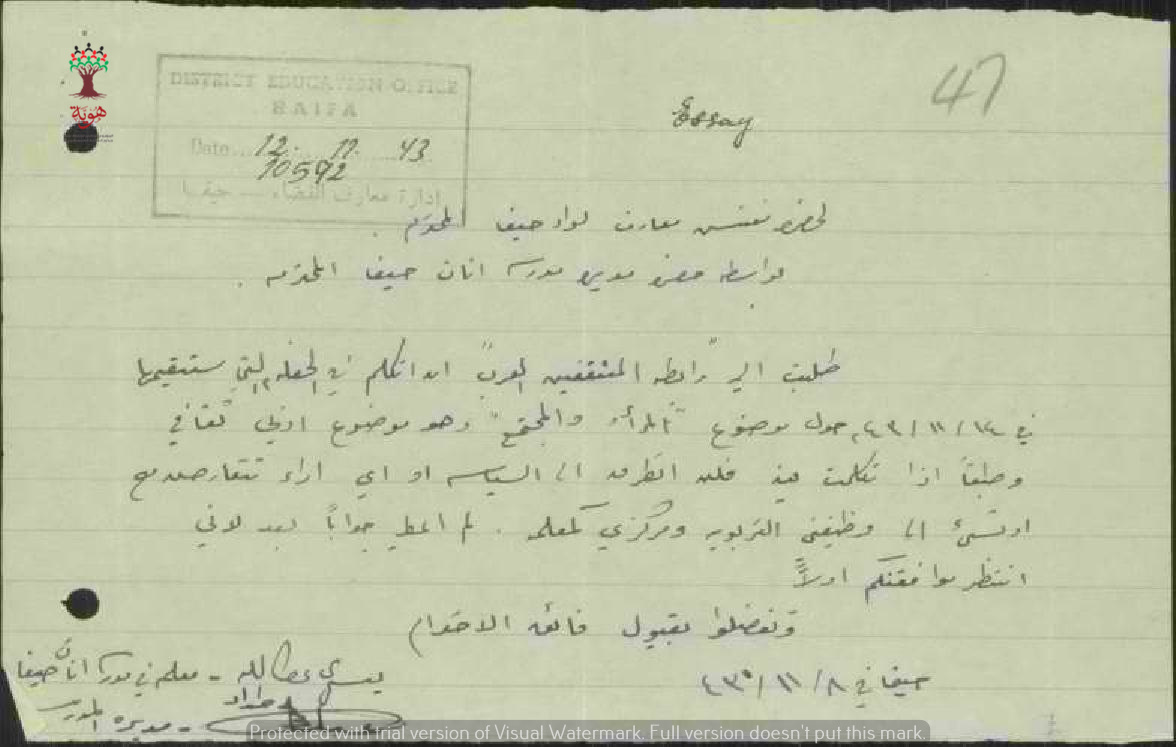 رسالة من المعلمة يسرى عطا الله الى مفتش المعارف بخصوص تقديم حفل في "رابطة المثقفين العرب"