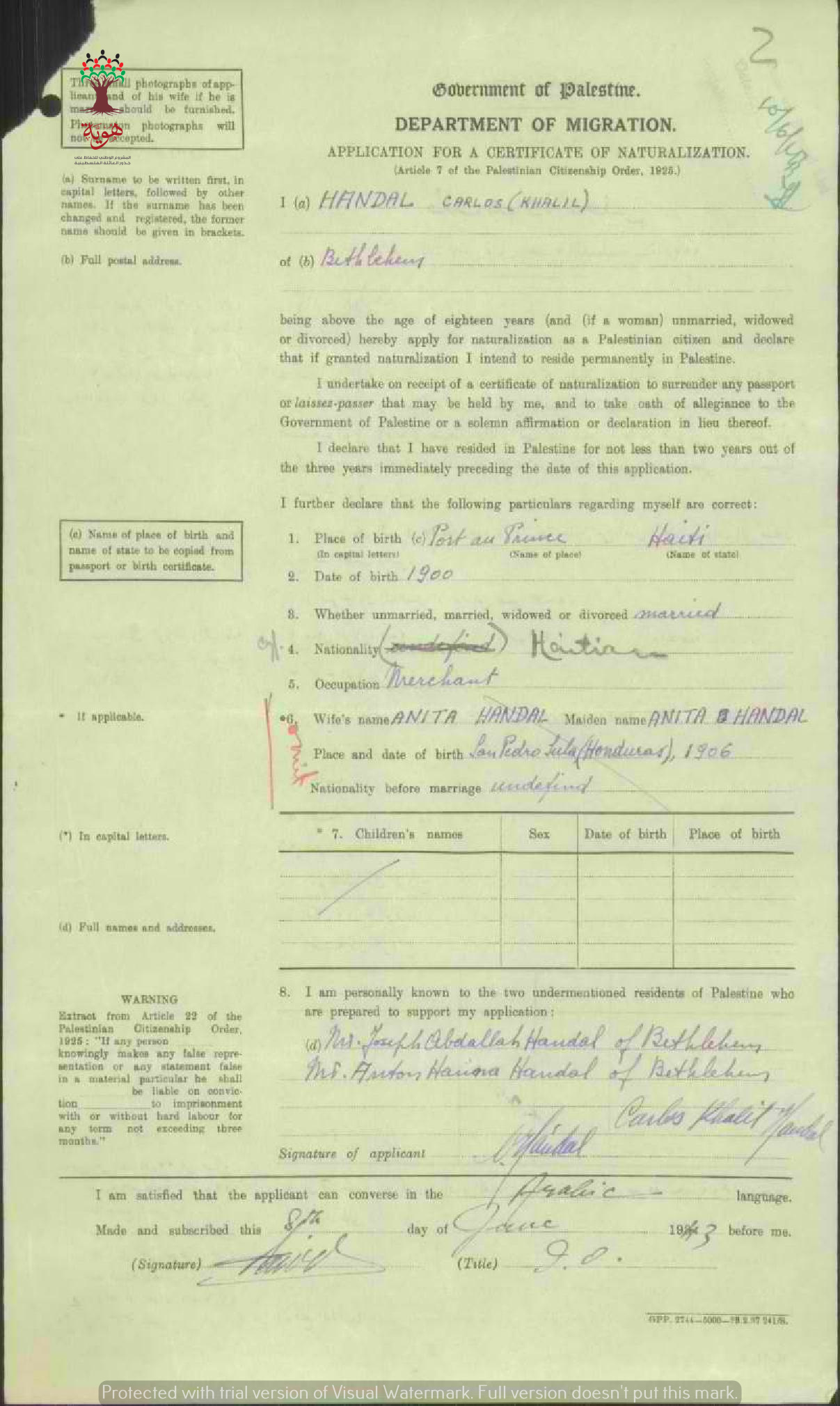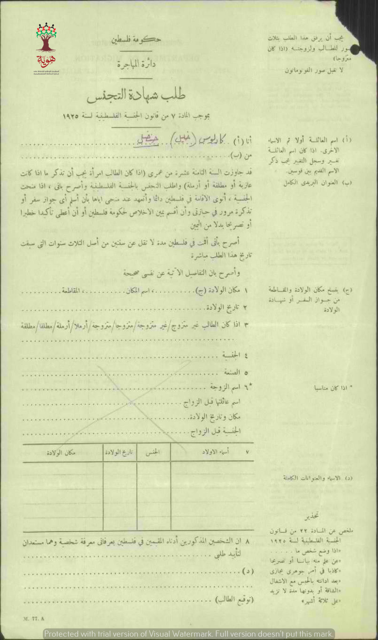 طلب الجنسية الفلسطينية-كارلوس خليل حنضل-بيت لحم/هاييتي