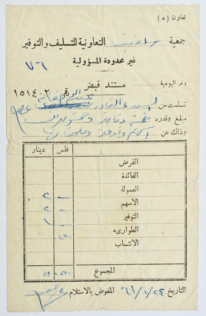 وثيقة مكونة من صفحة واحدة تتضمن سند قبض صادر عن جمعية سلفيت التعاونية للتسليف والتوفير لعبد القادر عبد الله عفانة، حيث دفع عبد القادر عفانة 5 دنانير و50 فلس ثمن أسهم توفير وملحقاتها.