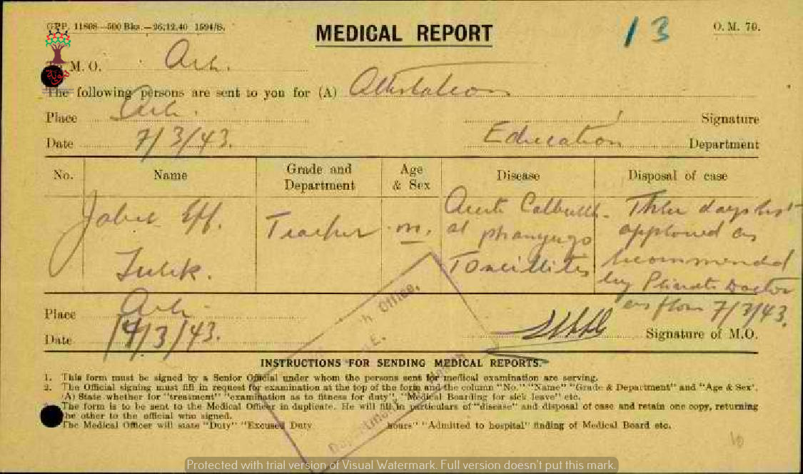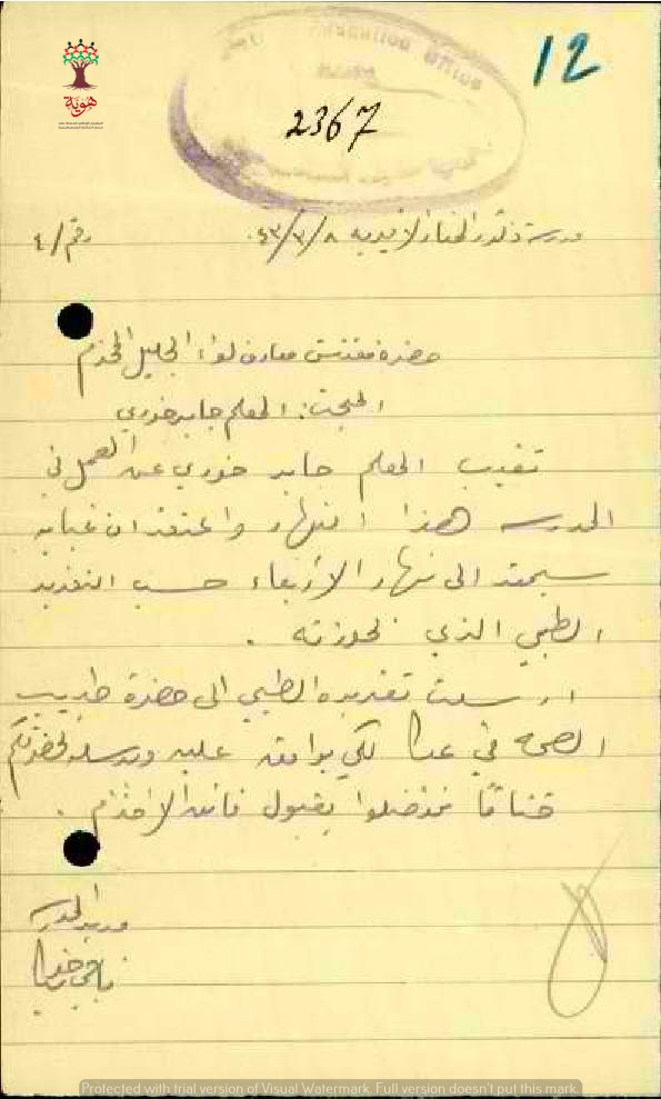 رسالة من مدير مدرسة المغار الى مفتش المعارف بخصوص تغيب المعلم جابر زريق مرفقة بالتقرير الطبي