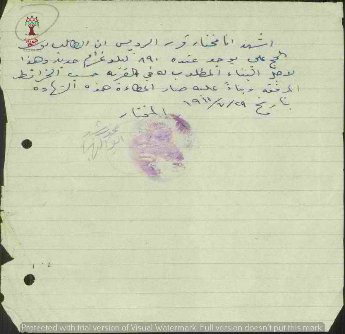 شهادة من المختار رشيد أبو الهيجا بأن يوسف الحج علي لديه 890 كيلوغرام حديد للبناء