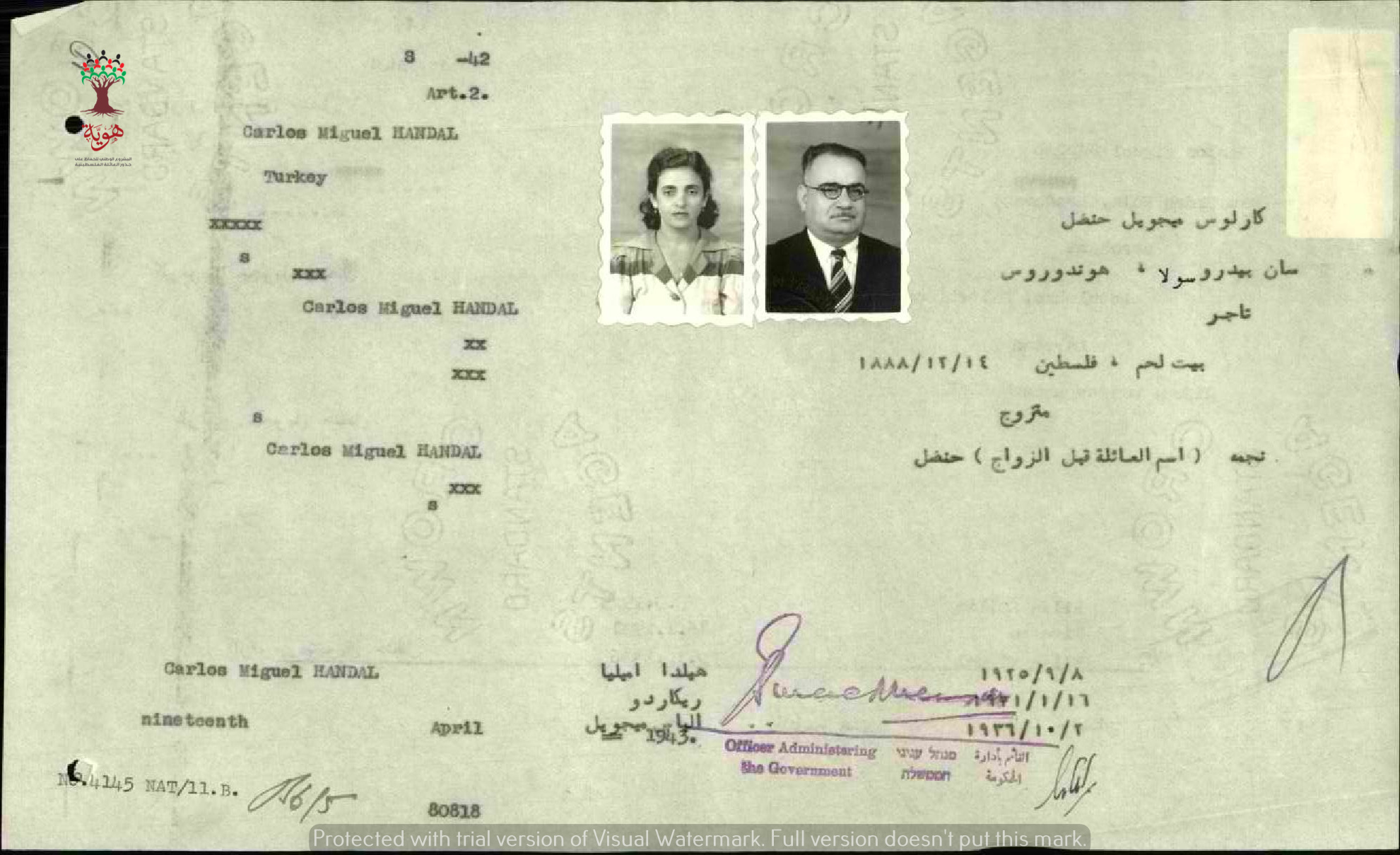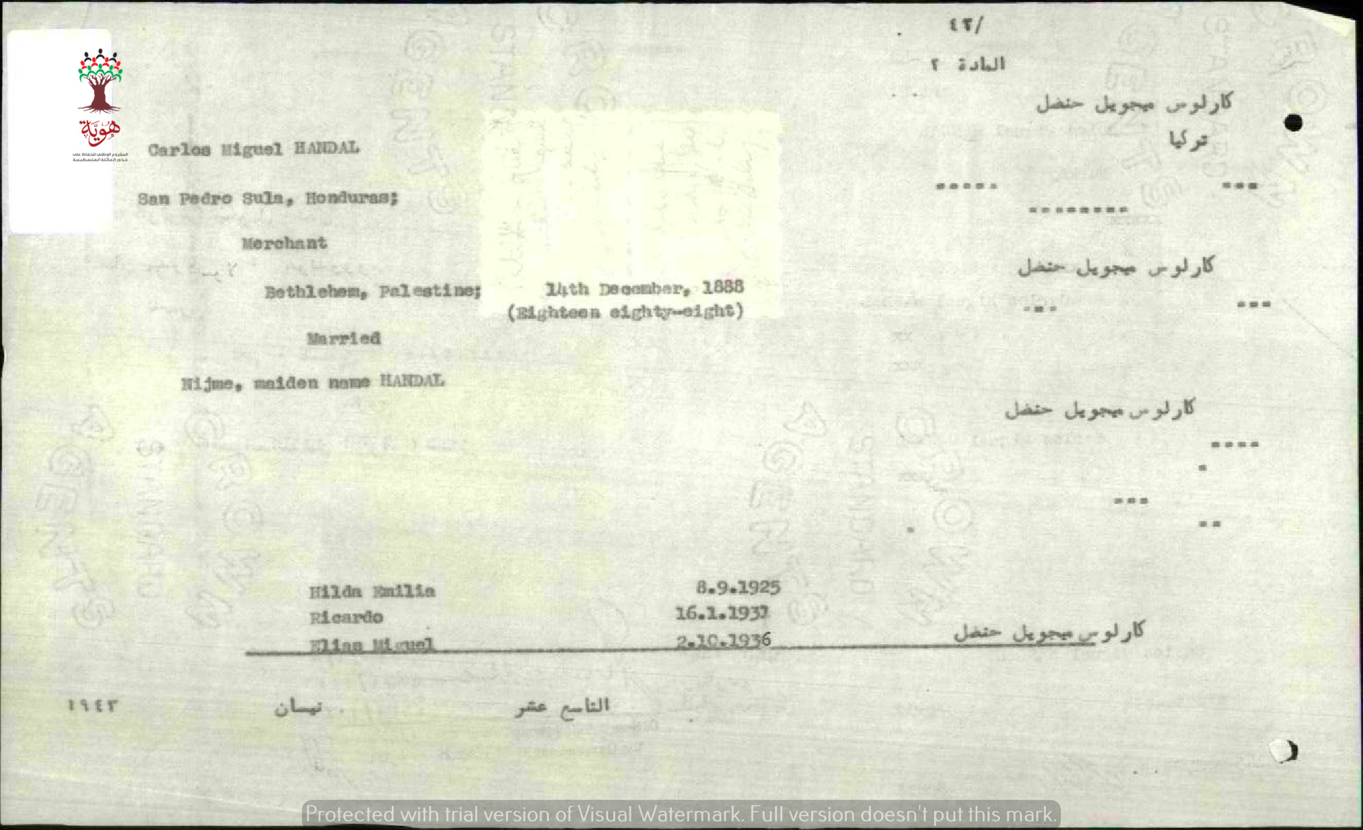 ورقة بيانات كارلوس ميخائيل حنضل المرفقة بطلب الجنسية