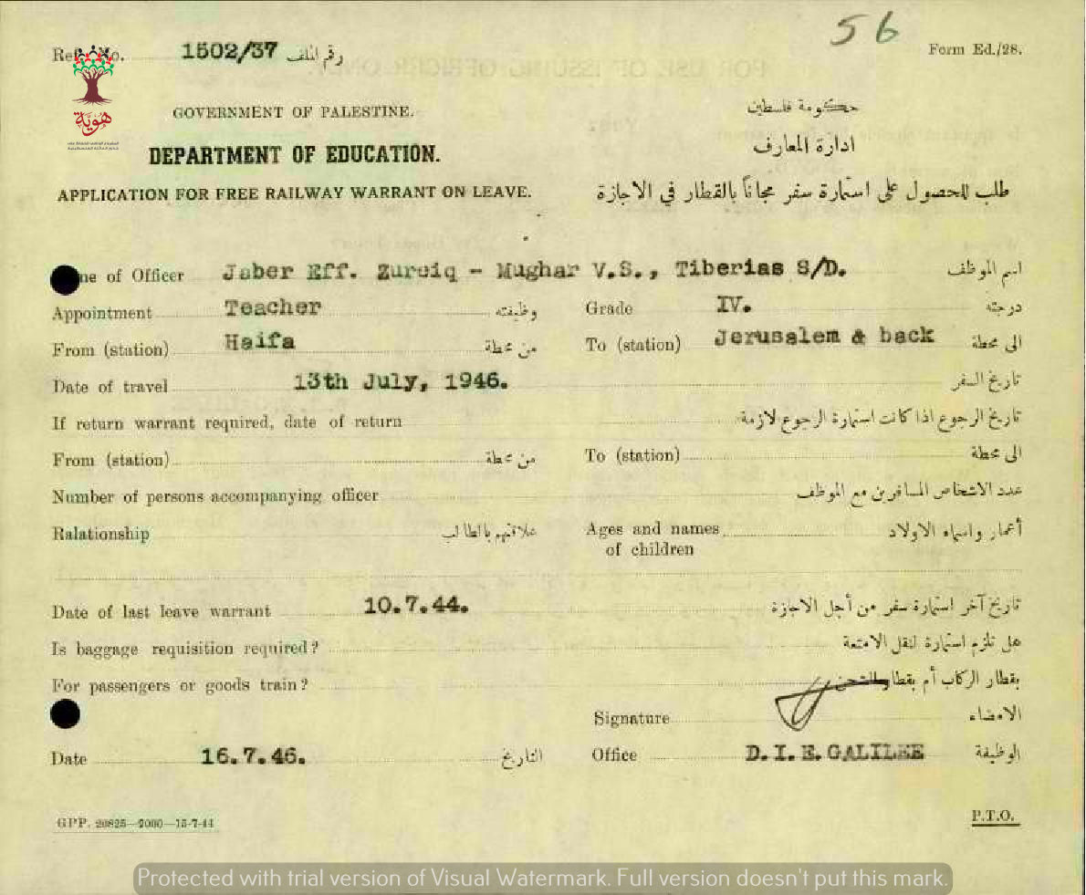 طلب استمارة سفر مقدمة من قبل المعلم جابر زريق - عيلبون - مدرسة المغار